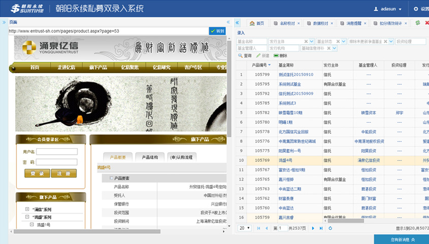 - 錄入系統(tǒng):使用錄入系統(tǒng)錄入基金產(chǎn)品和凈值信息,提交校對人員校對。高權(quán)限人員可分配隊列中的任務(wù)給指定的錄入人員等