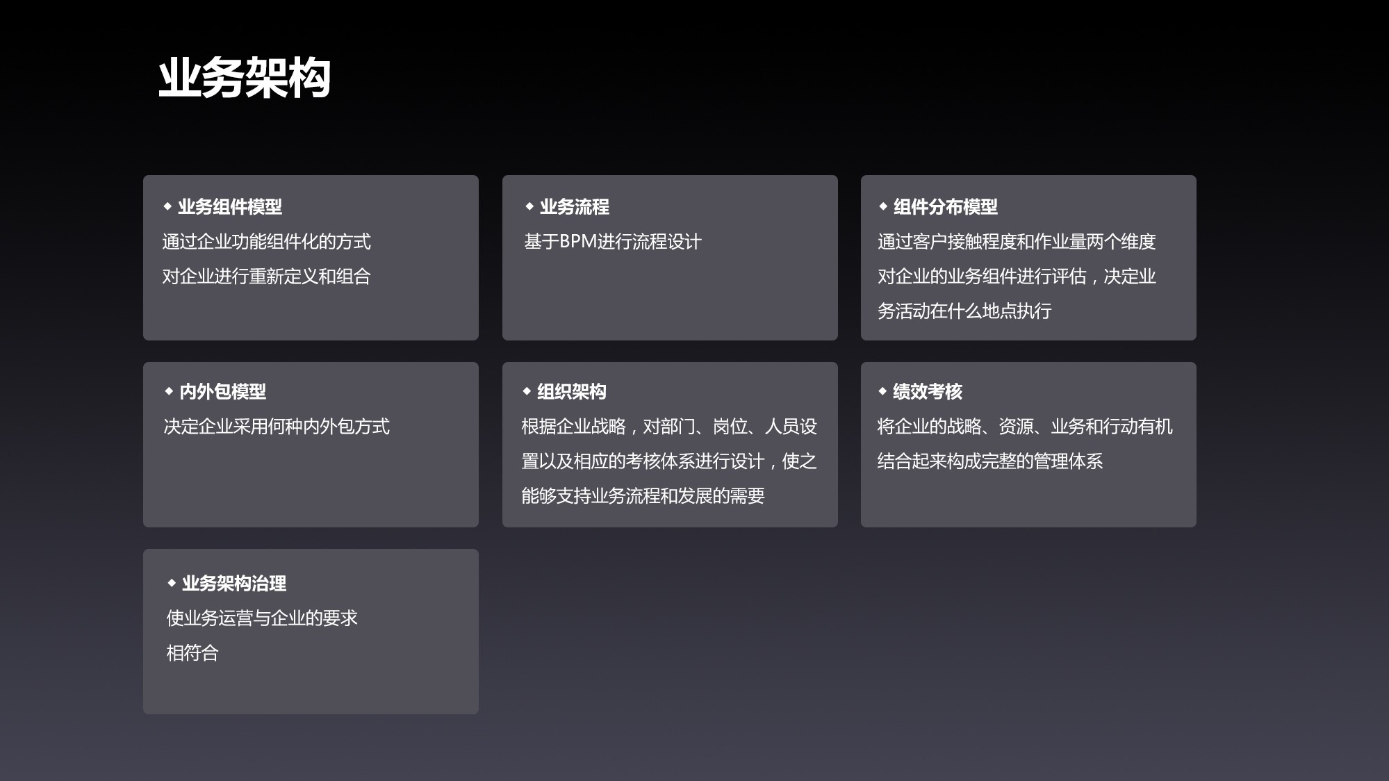 基于BPM設(shè)計(jì)業(yè)務(wù)流程,結(jié)合管理層ARC - ERP系統(tǒng)與“樞理”數(shù)據(jù)治理,梳理、優(yōu)化流程,消除冗余環(huán)節(jié),提升運(yùn)轉(zhuǎn)效率;借組件分布模型,從客戶接觸程度和作業(yè)量維度,評(píng)估業(yè)務(wù)組件,合理規(guī)劃業(yè)務(wù)活動(dòng)執(zhí)行地點(diǎn),降低運(yùn)營成本;以內(nèi)外包模型,科學(xué)決策業(yè)務(wù)外包方式,聚焦核心競(jìng)爭力;依據(jù)戰(zhàn)略設(shè)計(jì)組織架構(gòu),適配部門、崗位、人員及考核體系,為業(yè)務(wù)流程筑牢組織支撐;通過績效考核,串聯(lián)戰(zhàn)略、資源、業(yè)務(wù)與行動(dòng),構(gòu)建完整管理體系;依托業(yè)務(wù)架構(gòu)治理,確保業(yè)務(wù)運(yùn)營貼合企業(yè)要求,讓戰(zhàn)略落地“看得見、摸得著”。